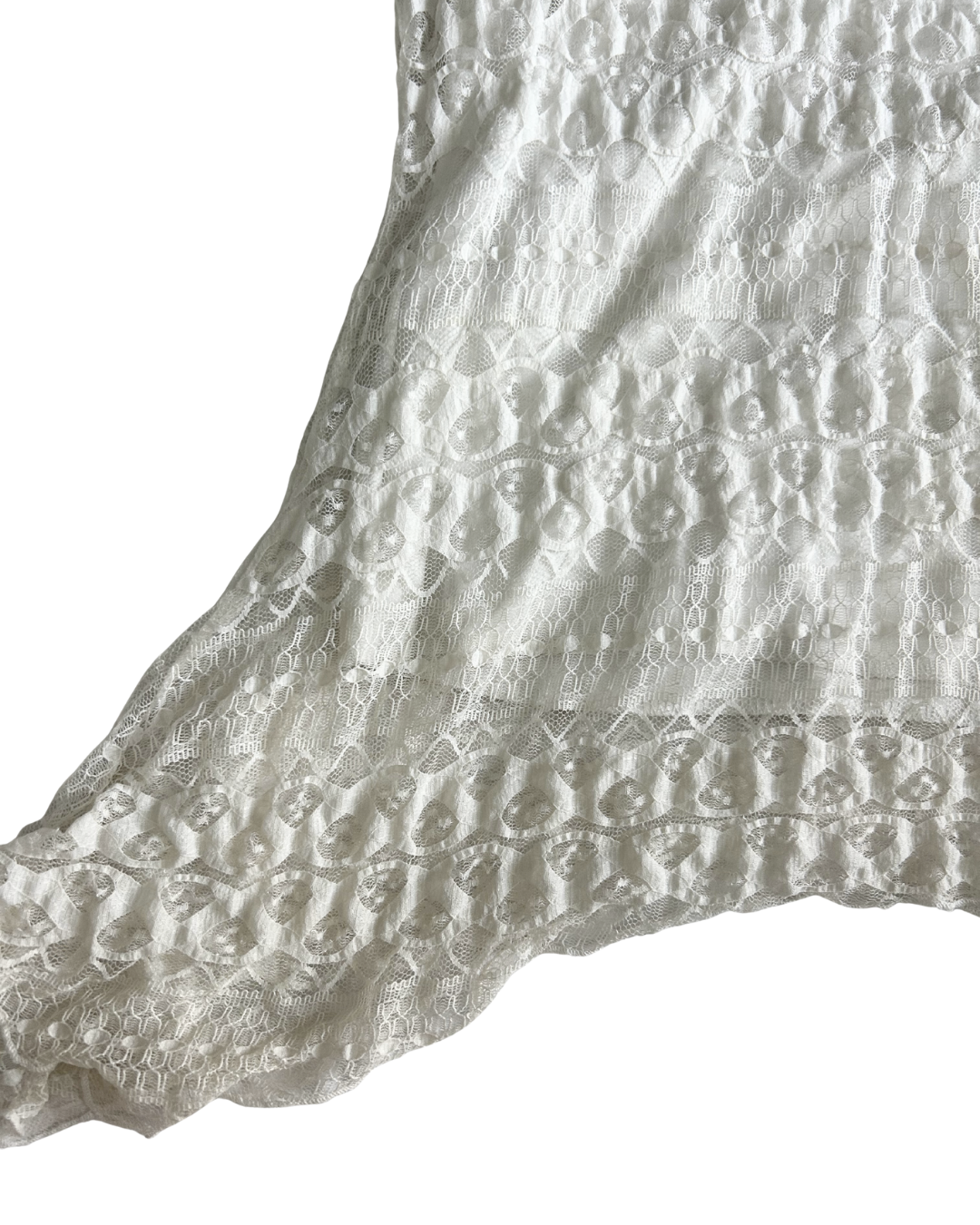Whimsical white T shirt with lace detailing overlay that comes down on the side. Can be worn as a coverup, minidress, or regular Tee
